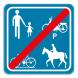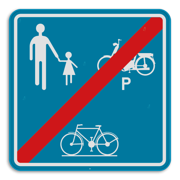 F99a: Dit verkeersbord geeft aan dat vanaf hier de weg of een gedeelte van deze weg niet meer voorbehouden is voor het verkeer van voetgangers, fietsers, ruiters en bestuurders van speed pedelecs.