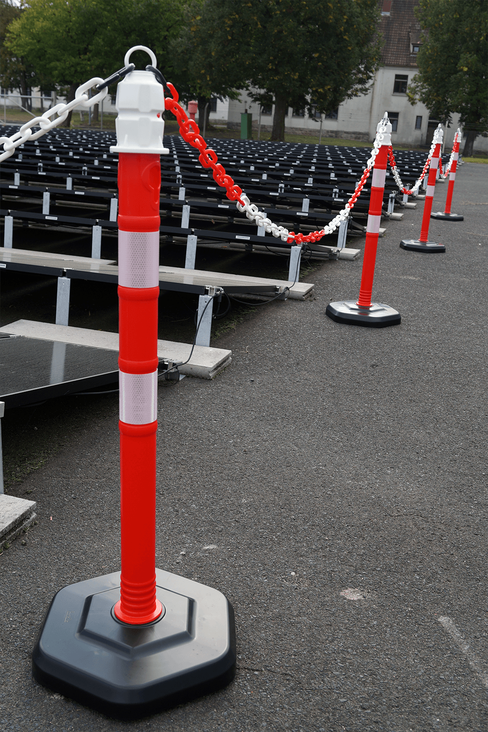 Deze set van 6 kunststof afzetpaaltjes is ideaal voor het snel en visueel afbakenen van zones in uiteenlopende omgevingen. Denk aan parkings, werfzones of tijdelijke doorgangen bij evenementen.