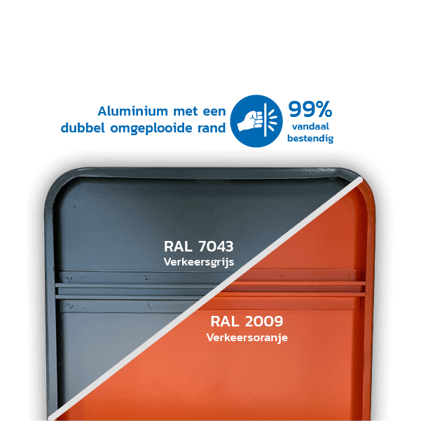 Dit bord is uitgevoerd in gepoedercoat aluminium met een dubbel omgeplooide rand en een volledig reflecterende voorzijde. De bordrand is afgewerkt in verkeerswit en de achterzijde is beschikbaar in verkeersgrijs of verkeersoranje. Daarnaast is dit model voorzien van anti-graffiti laminaat, een sterke vandaalbestendige opbouw, CE-markering en Belgische productie. Dat maakt het geschikt voor duurzame plaatsing op locaties waar het bord lang zichtbaar en netjes moet blijven.